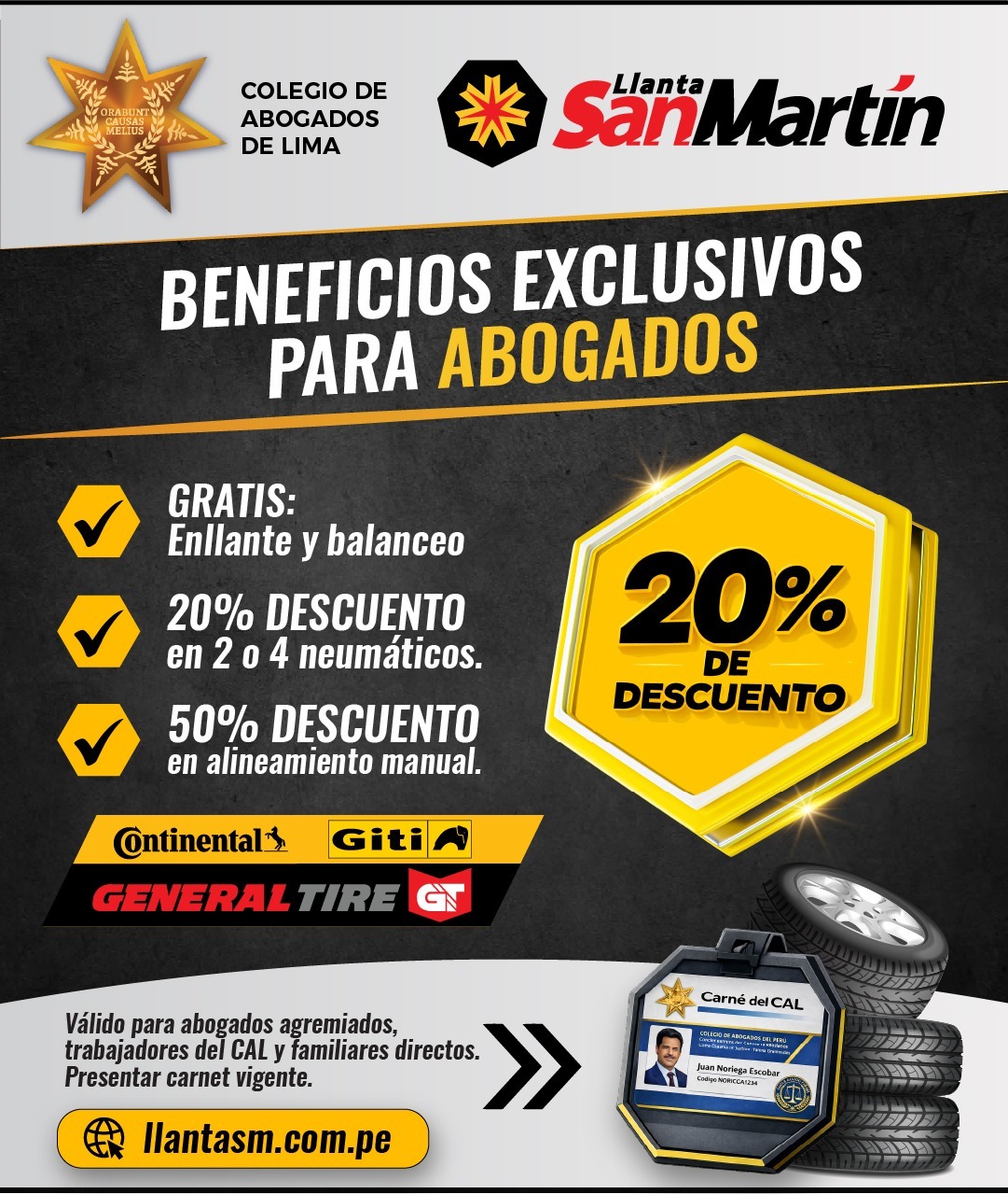 Aprovecha el convenio entre el Colegio de Abogados de Lima y Llanta San Martín accediendo a descuentos especiales en neumáticos de marcas reconocidas, además de servicios gratuitos de enllante y balanceo.