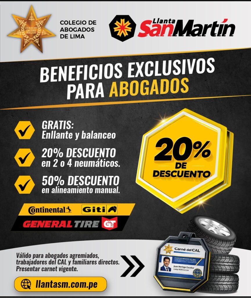 El Colegio de Abogados de Lima (CAL) y la empresa Llanta San Martín S.R.L.TDA. han suscrito un Convenio de Cooperación Interinstitucional con el objetivo de brindar beneficios exclusivos a los abogados agremiados, trabajadores del CAL y sus familiares directos.